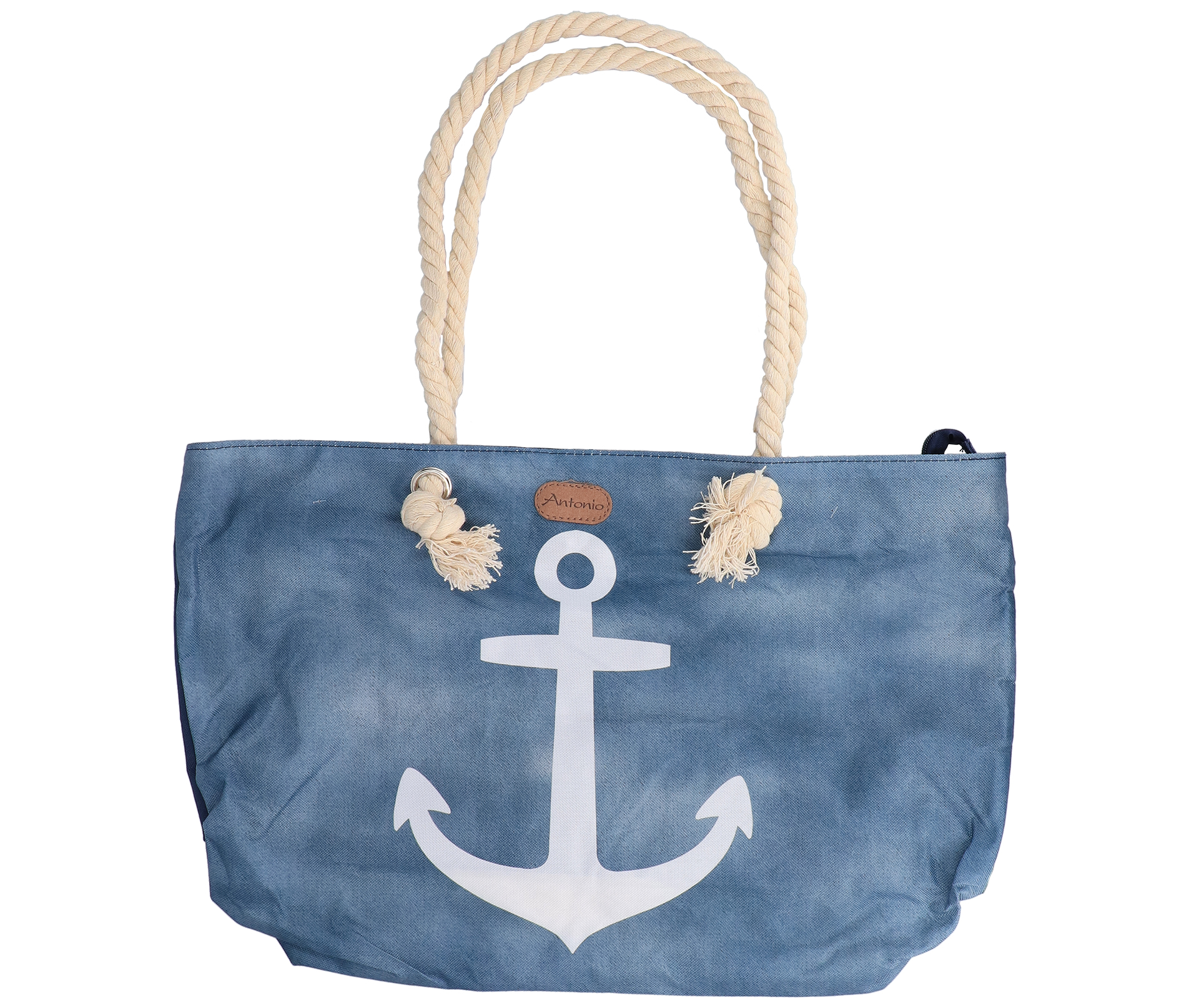 Diese große maritime Strandtasche überzeugt mit ihrem stilvollen Blau und dem detailreichen Anker-Muster. Ein dekorativer Knoten verleiht der Tasche einen besonderen Akzent und unterstreicht das Küsten-Design.