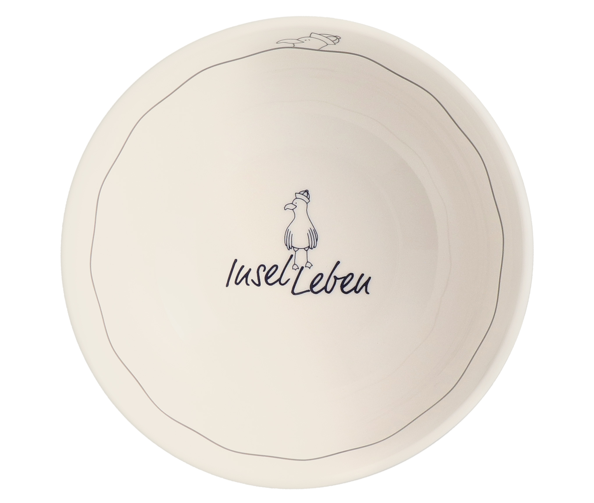 Diese elegante Müslischale in Blau-Weiß kombiniert maritimes Design mit stilvollem Flair. Außen ist die Schale in einem frischen Blau gehalten, das durch zwei weiße linien aufgelockert wird. Das Innere der Schale ist in strahlendem Weiß, mit einer Möwe und dem Schriftzug „Inselleben“ auf dem Boden – ein schöner Akzent, der an das Meer erinnert. Ideal für Müsli, Joghurt oder Snacks, bringt diese Schale einen Hauch von Küstenromantik auf Ihren Tisch.