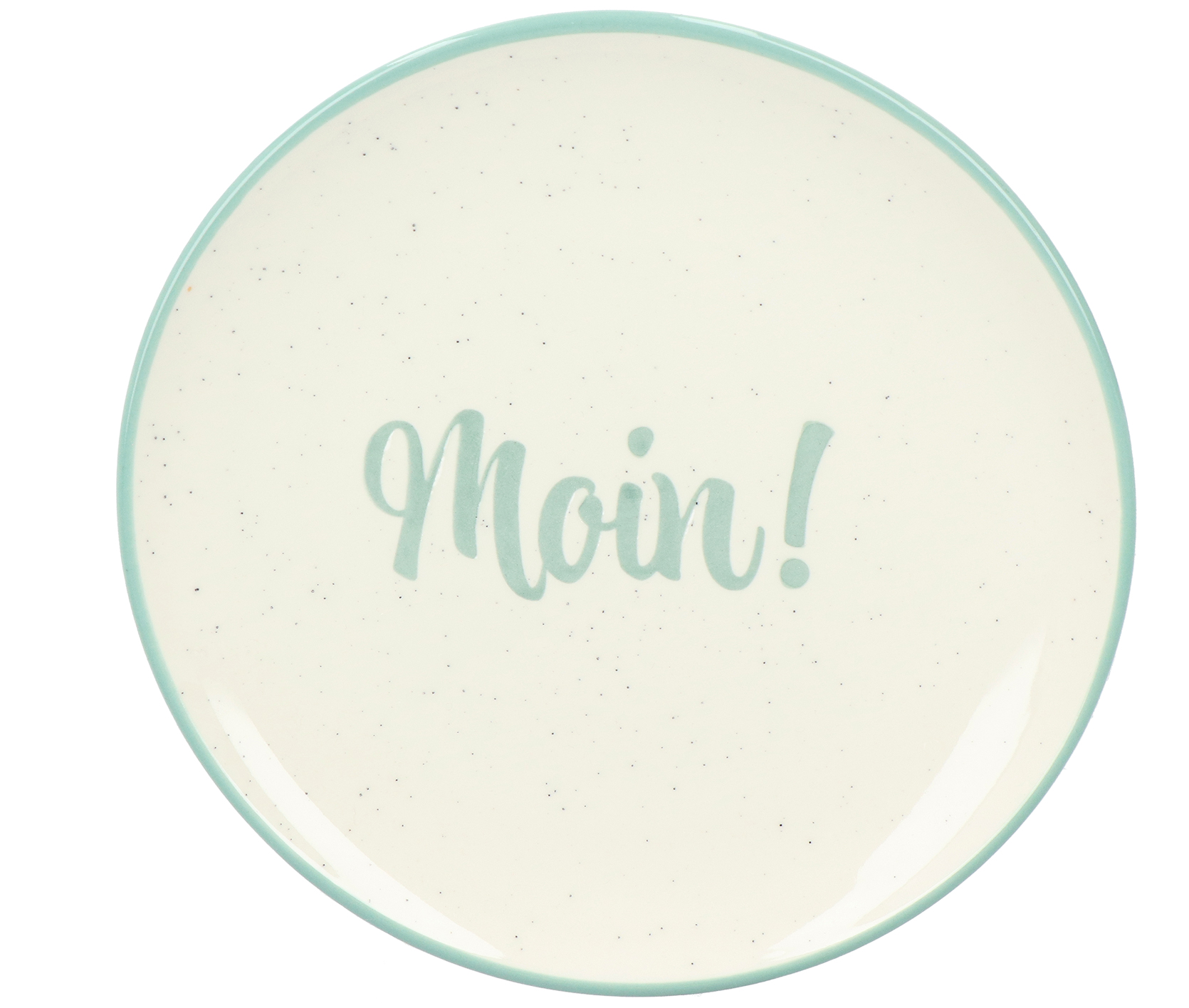 - Weißer Teller mit blauem Rand und „Moin“-Motiv
