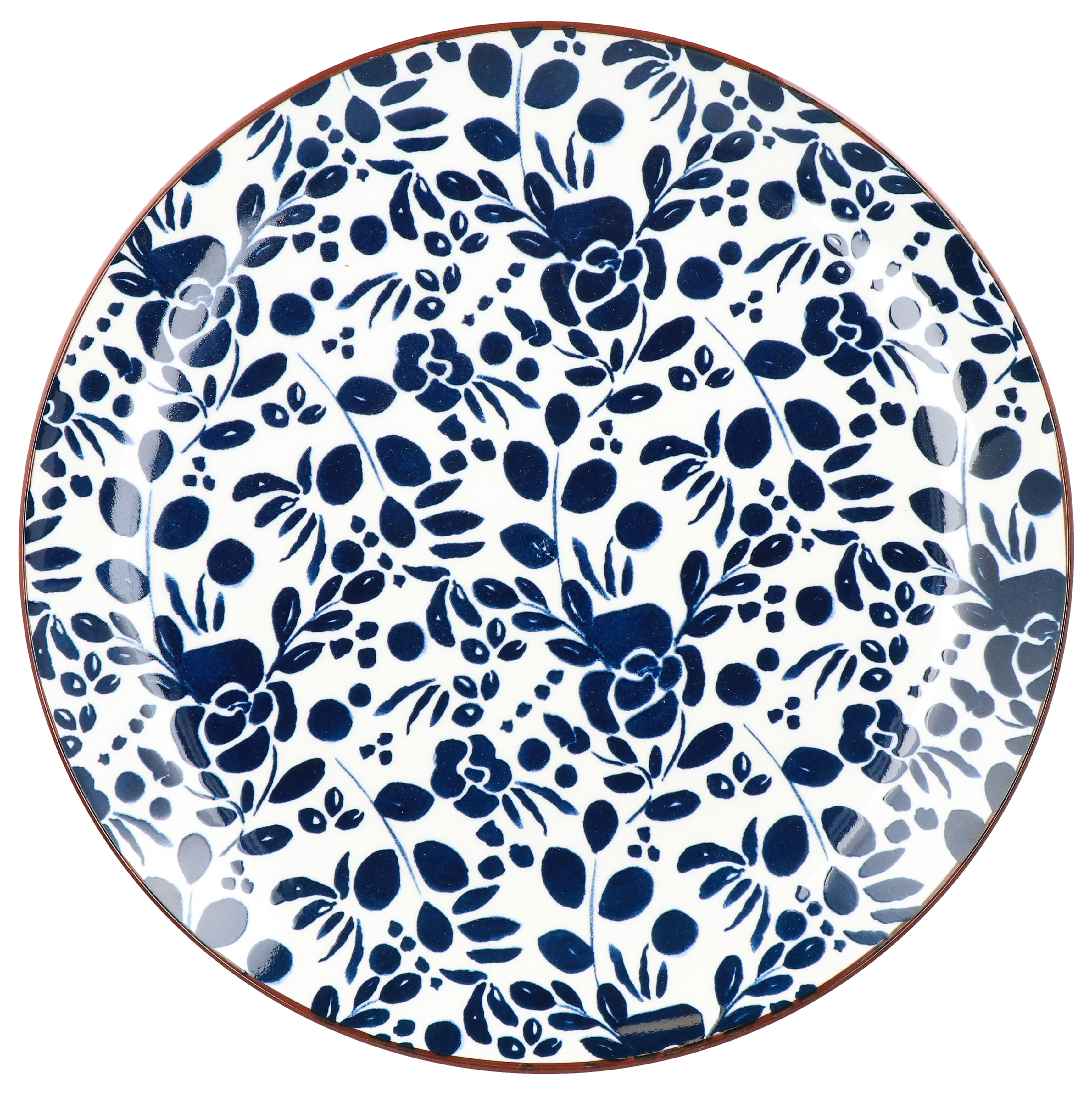 Der Porzellanteller Flower-Small präsentiert ein harmonisches, mittelgroßes Blumenmuster in elegantem Dunkelblau auf weißem Grund.