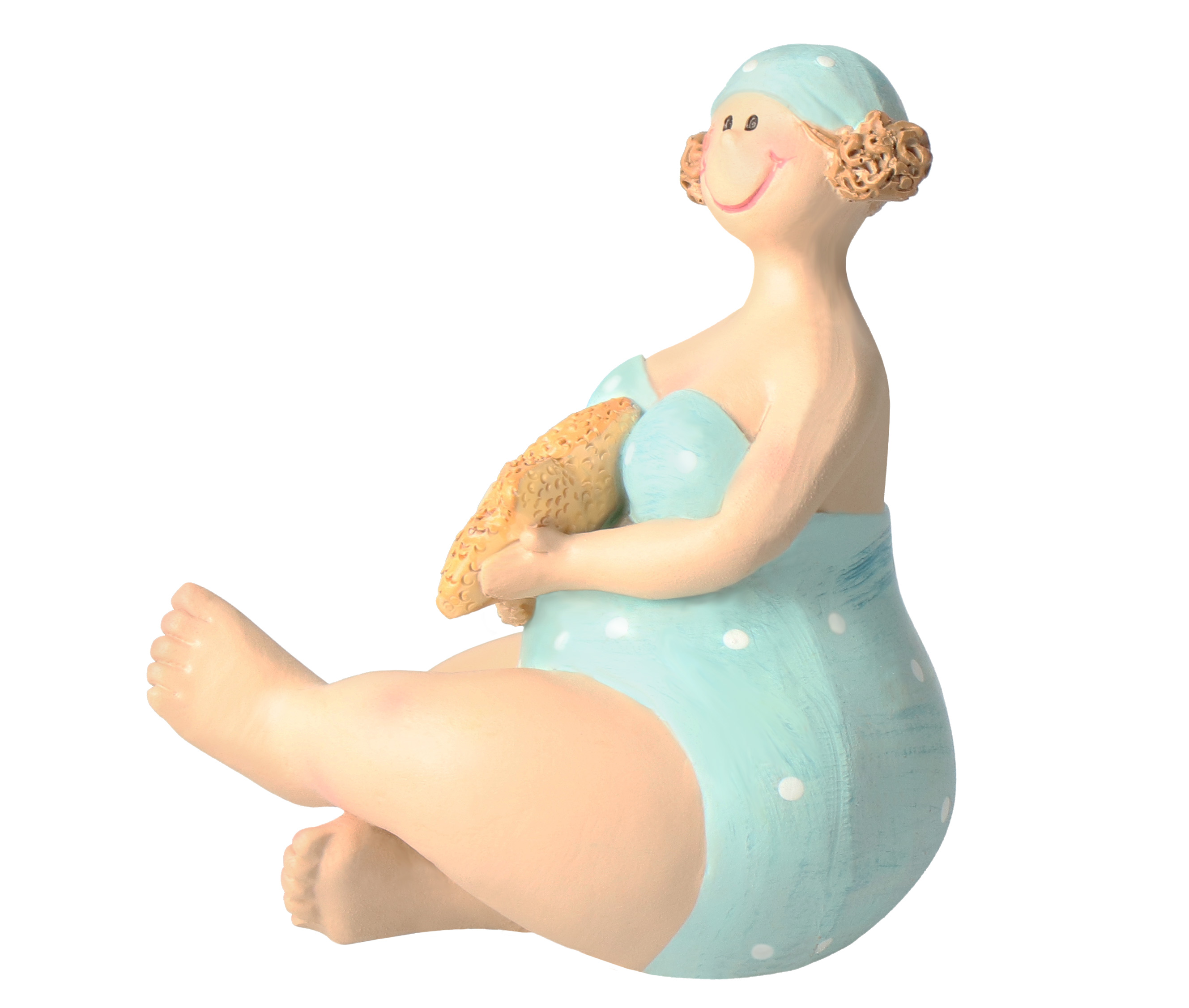 Diese stillvolle Dekofigur versprüht pures Sommerfeeling und maritimen Charme. In einem frischen türkisfarbenen Bikini sitzt die Frau entspannt im Schneidersitz und hält lächelnd einen Seestern in der Hand- als Erinnerrung an einen Tag am Meer. Mit liebevollen Details und einer natürlichen Ausstrahlung ist sie ein hübscher Blickfang für Fensterbank,Regal oder Badezimmer und bringt eine Prise Strandglück in jedes Zuhause.