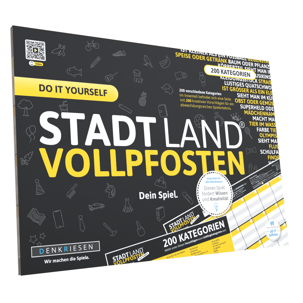 Die Stadt Land Vollpfosten Do It yourself Edition ist eine actionreiche Variante des beliebten Wortspiels „Stadt, Land, Vollpfosten“. Hier geht es nicht nur darum, Begriffe zu finden, sondern Aufgaben und Challenges in die Spielrunden zu integrieren. Die Mischung aus Schnelligkeit, Kreativität und kleinen Mutproben sorgt für dynamische, lustige und besonders interaktive Spielerunden.