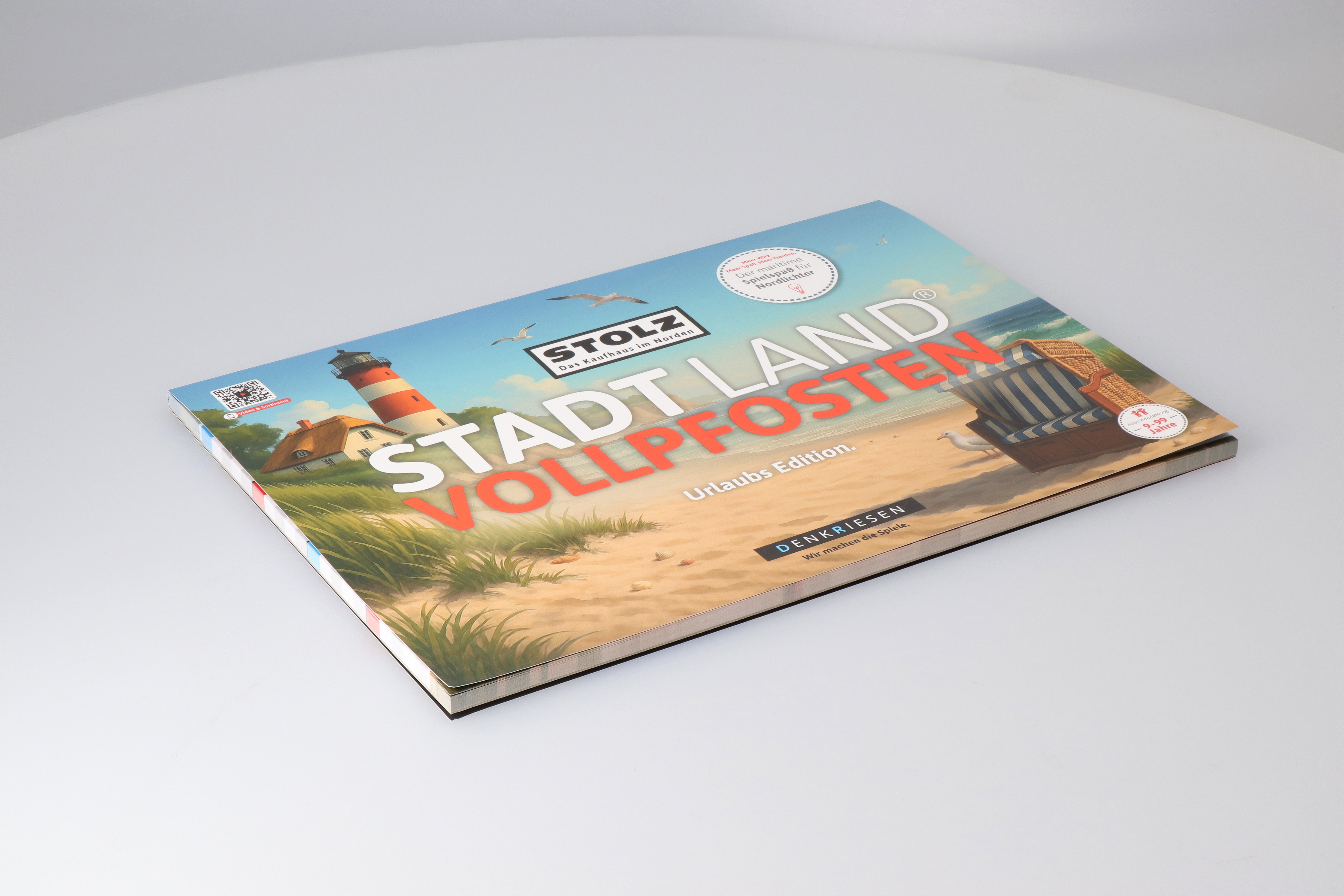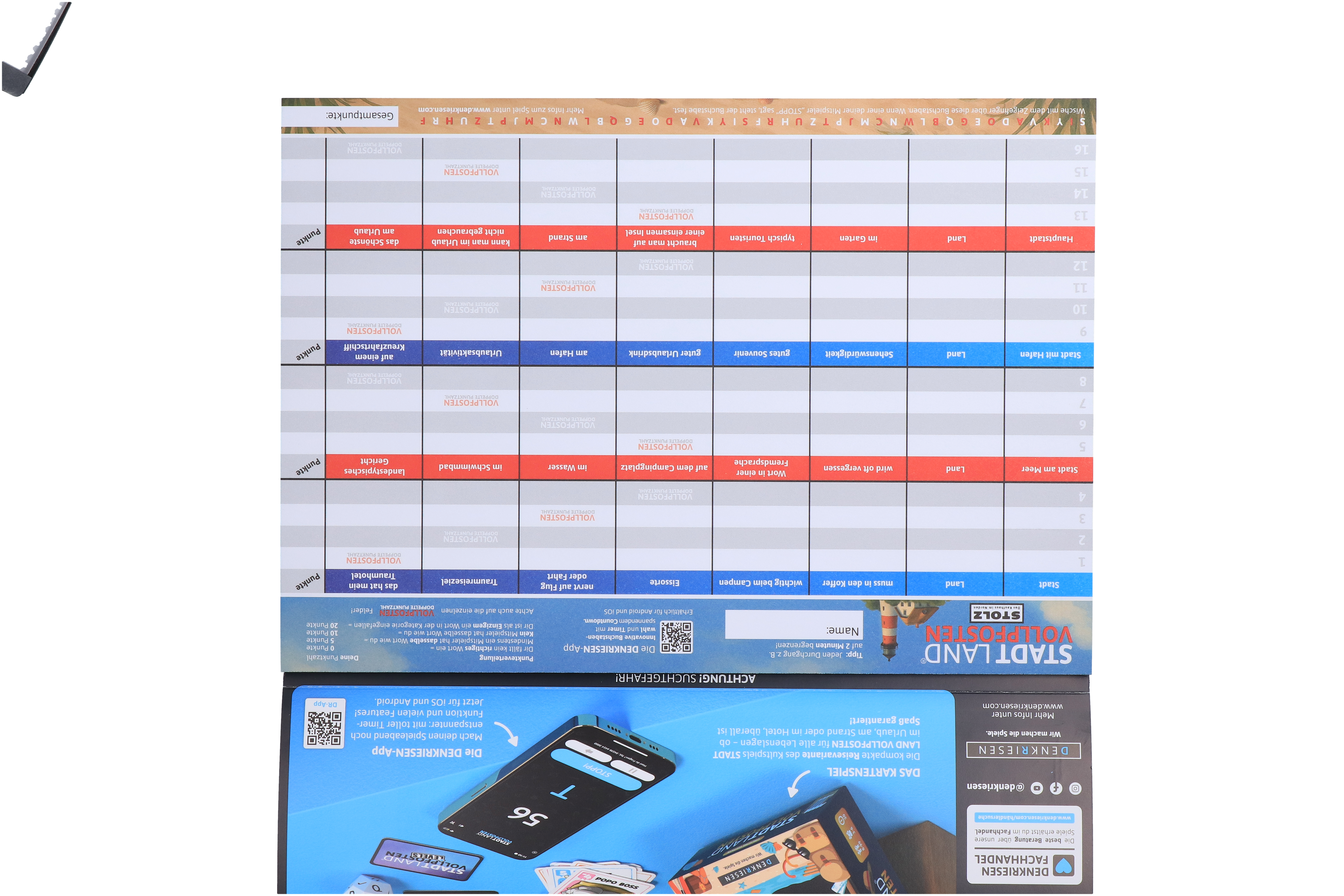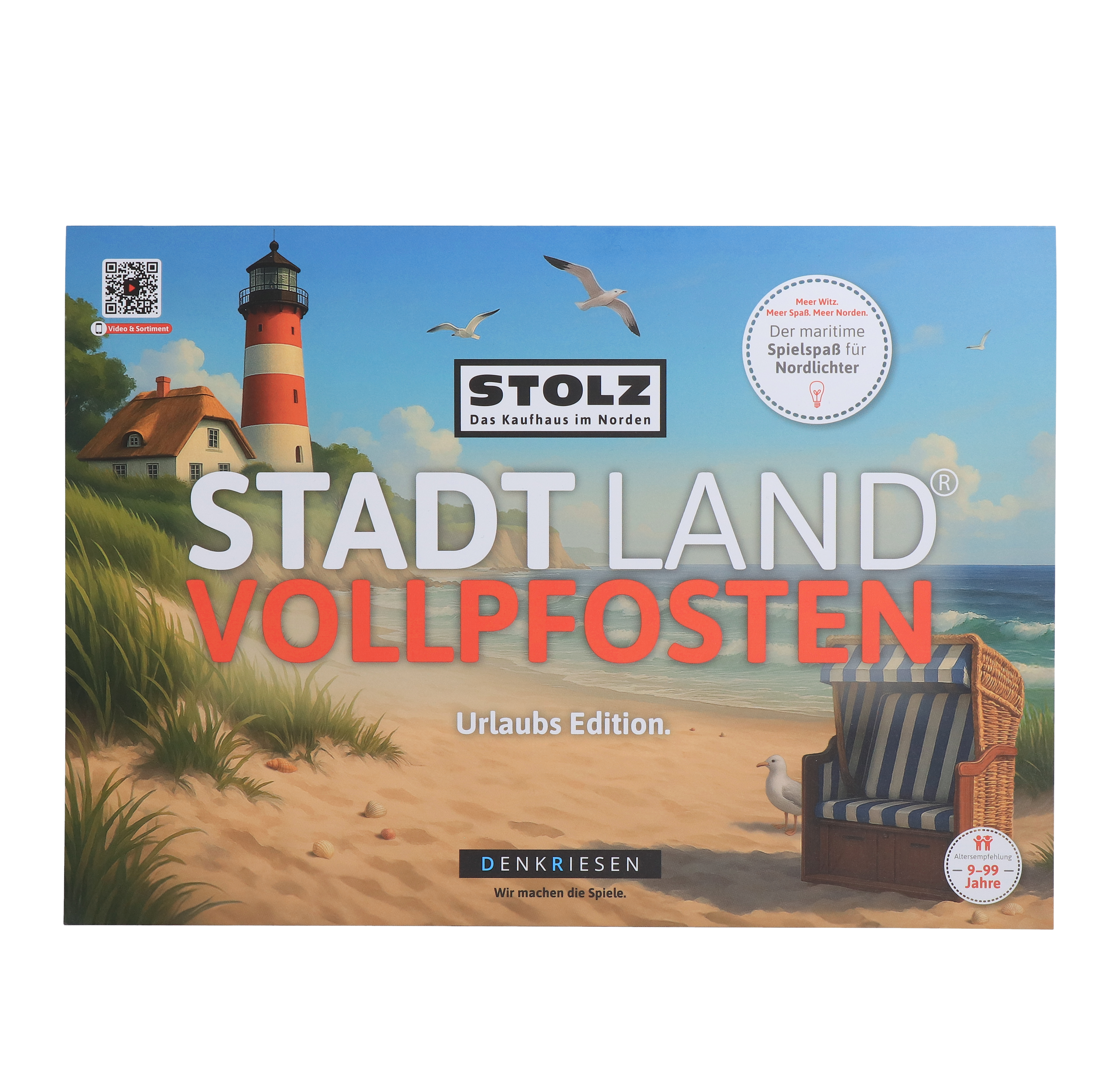 Die Stadt Land Vollpfosten – Urlaubs Edition ist die perfekte Spielbegleitung für die schönste Zeit des Jahres. In dieser besonderen Version dreht sich alles um Reisen, Sonne, Strand, Abenteuer und typische Urlaubsmomente. Ob im Ferienhaus, auf dem Campingplatz oder am Strand – dieses Spiel sorgt überall für unterhaltsame und kreative Runden. Diese Edition ist eine exklusive Kooperation zwischen Denkriesen und dem Kaufhaus Stolz. Gemeinsam vereinen sie Spielspaß und Urlaubsstimmung in einer hochwertigen Sonderausgabe.